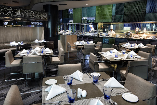 Azur is an all-day dining restaurant built around a show kitchen concept, with chefs presenting a lively cooking theatre at their live stations (see above) . The restaurant seats a maximum of 150 people, but also provides a 24-hour in-room dining service for hotel guests. I arrived soon after opening and was promptly seated. While waiting for the guests to arrive, I took in the surroundings and was greeted with some intricately-planned decor.